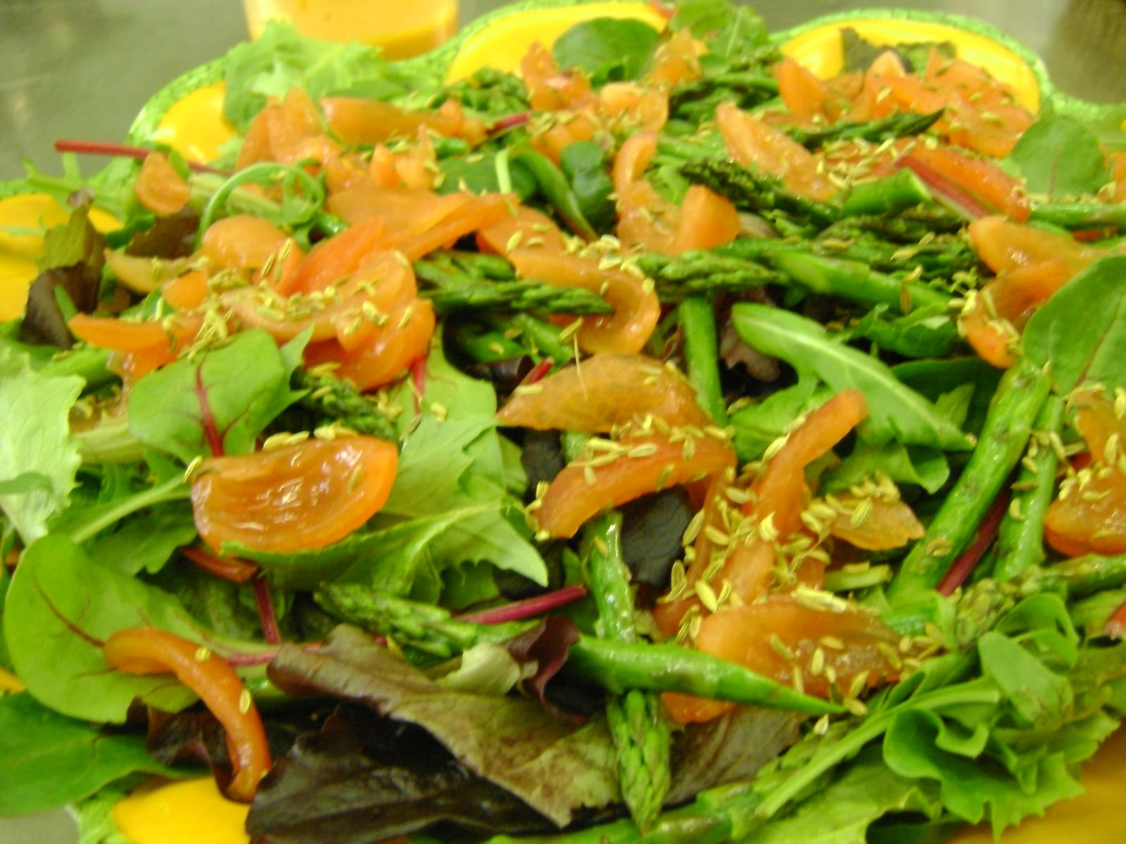 Het werd dus een pastei met vlees en appel, boerenpaté van slagerij lejeune met portvijgen (niet op de foto), een salade met groene asperge, tomaat-saffraandressing en venkelzaadjes,